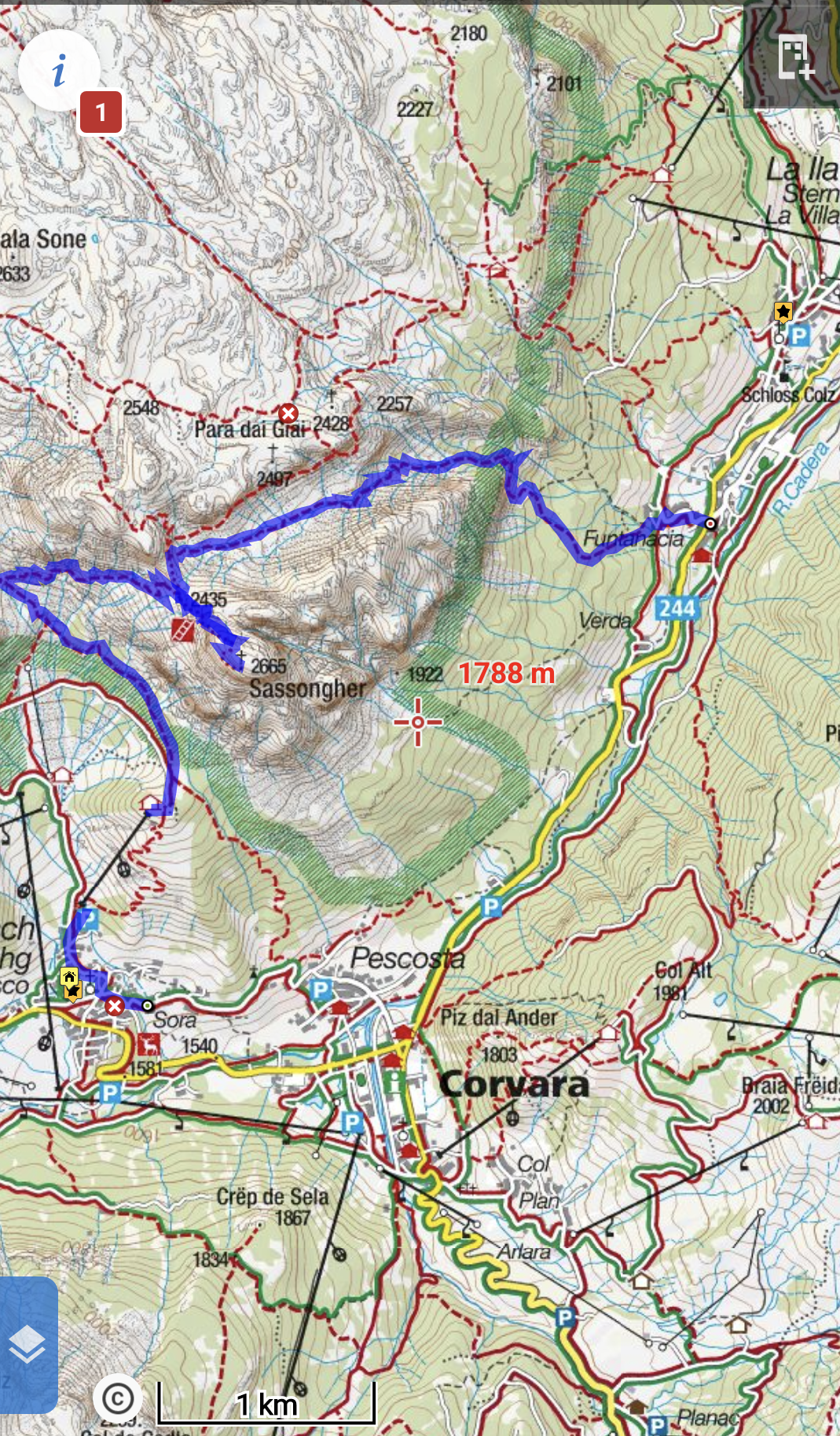 Passeggiata di media difficolta’, 900 m di dislivello da Colfosco se si prende la funivia, altrimenti 2-300 in piu’, in ogni caso ppercorribile in poche ore. Breve percorso attrezzato che non richiede attrezzatura da affrontare prima della vetta, dalla quale è possibile vedere uno spettacolare panorama sull’Alta Badia, il Sella e piu’ in lontananza, la Marmolada. .